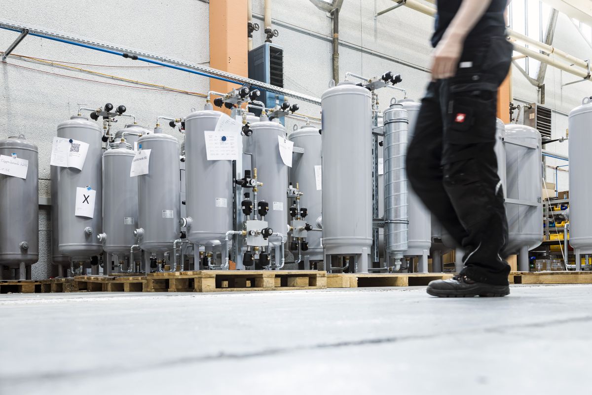 In den PSA-Anlagen von AIRCO verdichtet zunächst ein Kompressor die Umgebungsluft, die danach einen Stickstoff-Anteil von 79 Prozent enthält. Mittels PSA-Technologie, also durch Druckwechsel in den verschiedenen Behältern der Anlage, werden die in der Luft enthaltenen Gase voneinander getrennt. Der gewonnene Stickstoff wird im Anschluss mit Wasserstoff aufbereitet – so entsteht eine hochreine Gasqualität von 99,9999 Prozent. Dieses zweistufige System hat AIRCO sich 2009 als „PSAL“ patentieren lassen. Das L steht dabei für „Laser“ – das Produkt ist für den Einsatz in der Blech- und Metallverarbeitung konzipiert, eine der wichtigsten Branchen im Portfolio von AIRCO.