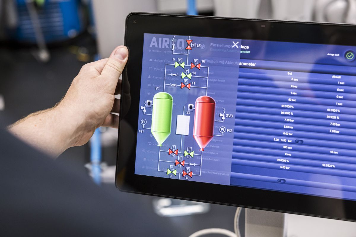 Eine digitale Steuerung über Tablet oder Smartphone ermöglicht es den Mitarbeitenden, die Solarstromnutzung einzustellen und zu berechnen, Produktionszeiten ihres Stickstoffgenerators zu definieren und Fehler mittels KI auszulesen.