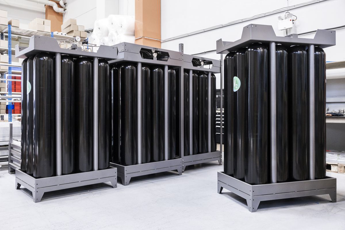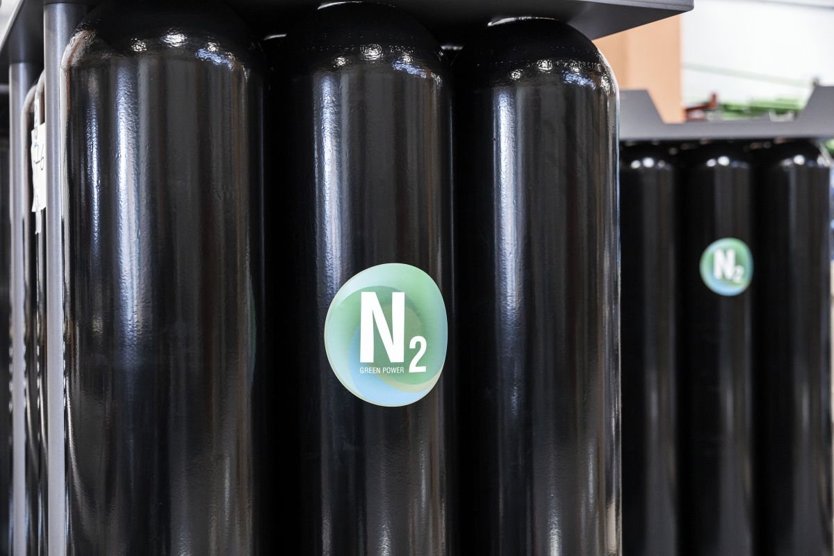 Nach der Gewinnung speichert das System den hochreinen Stickstoff mithilfe eines Hochdruckverdichters in sogenannten Bündeln aus jeweils 12 Gasflaschen à 50 Liter mit einem Druck von 300 bar. So entsteht eine Kapazität von 180 Normkubikmetern, die sich durch zusätzliche Bündel erweitern lässt.